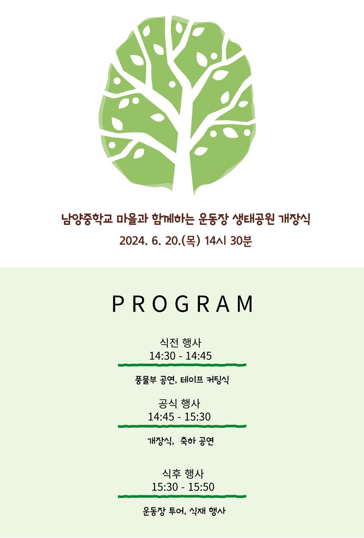 마을과 함께하는 운동장 생태공원 조성사업이 완료되어 도움 주신 분들을 모시고 아래와 같이 개장식을 개최하고자 합니다.