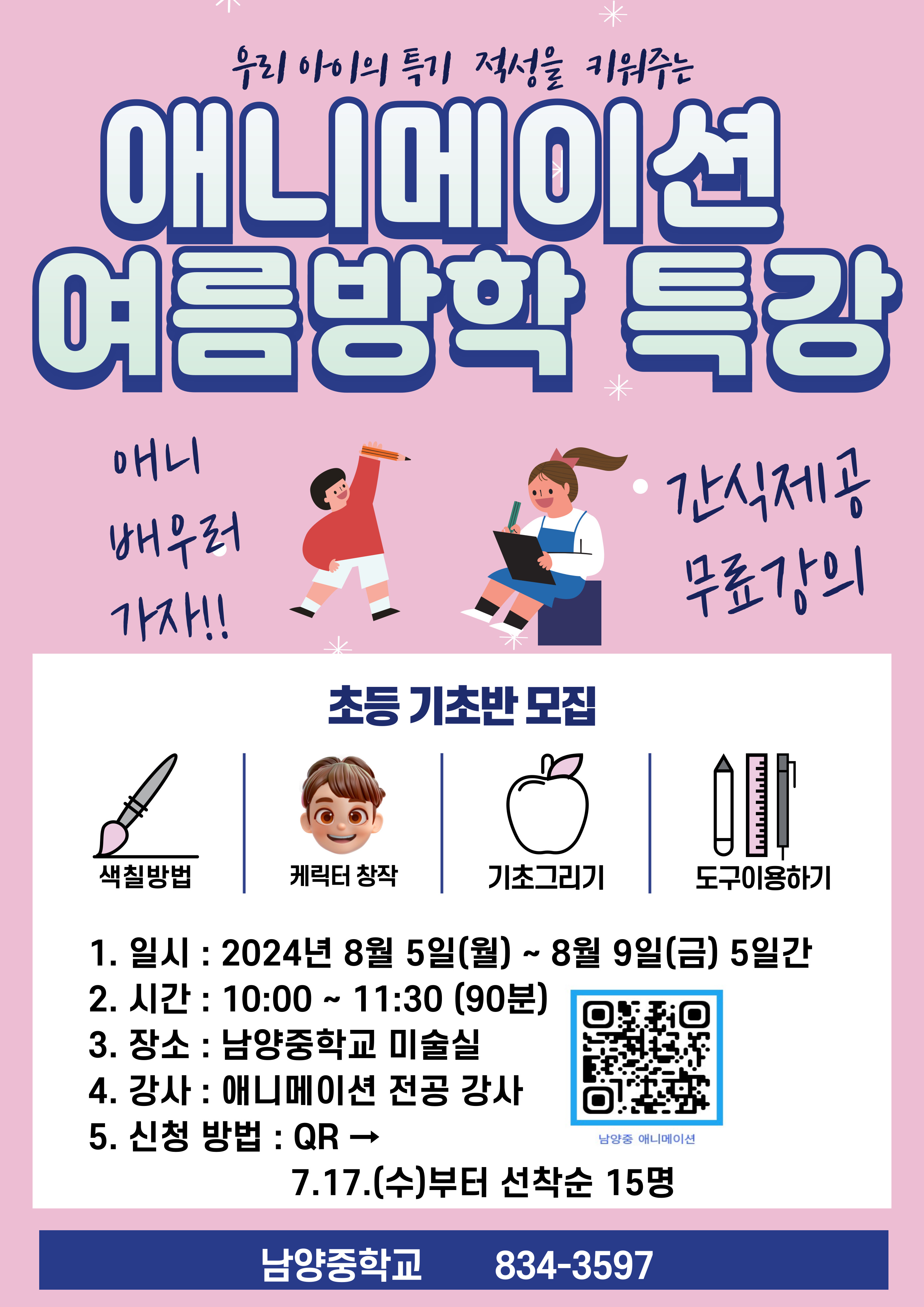 남양중학교 애니메이션 여름방학 특강 안내입니다.